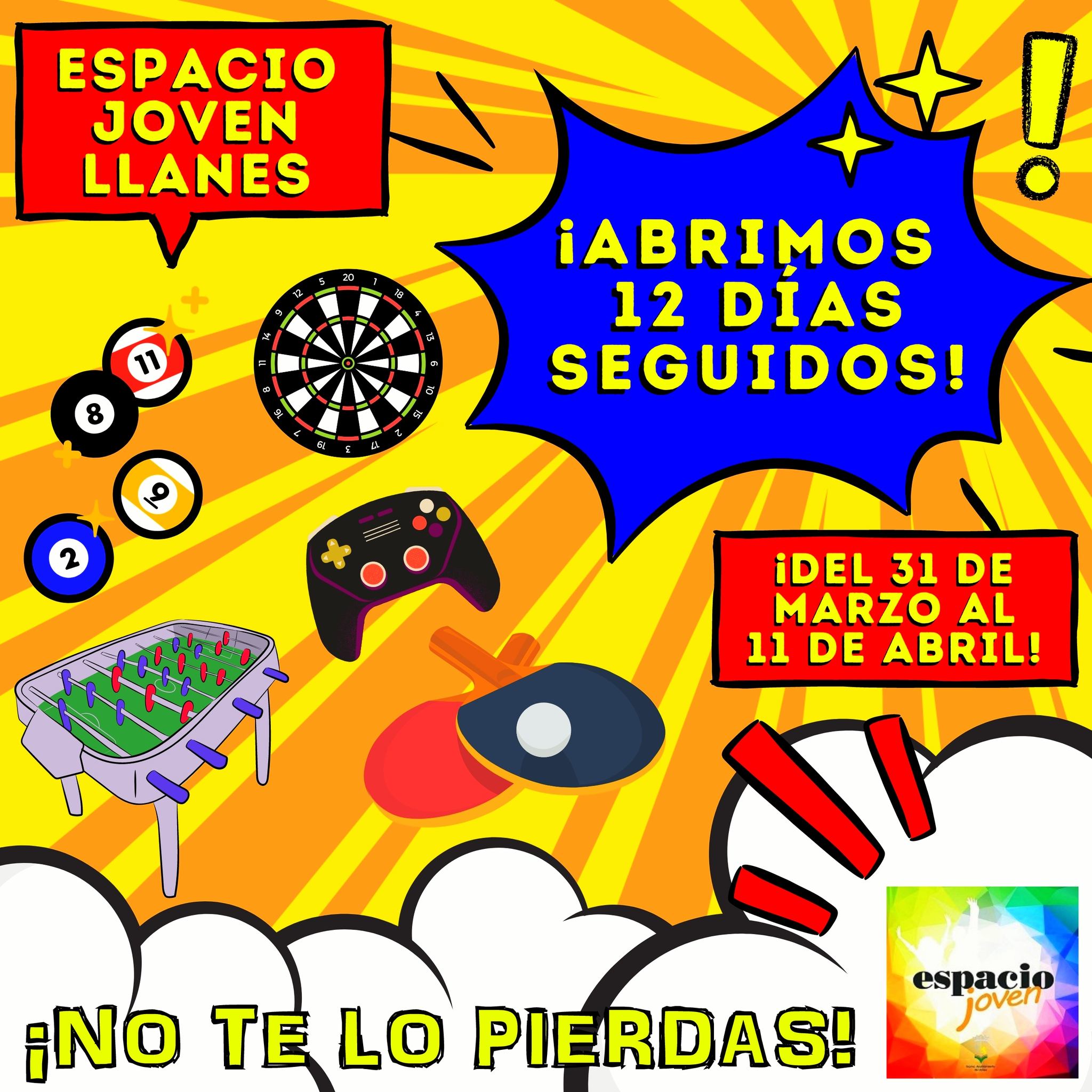Durante toda la Semana Santa, desde el 31 de marzo y hasta el 11 de abril, el Espacio Joven Llanes abrirá todos los días, de 18.30 a 21.30 horas.
