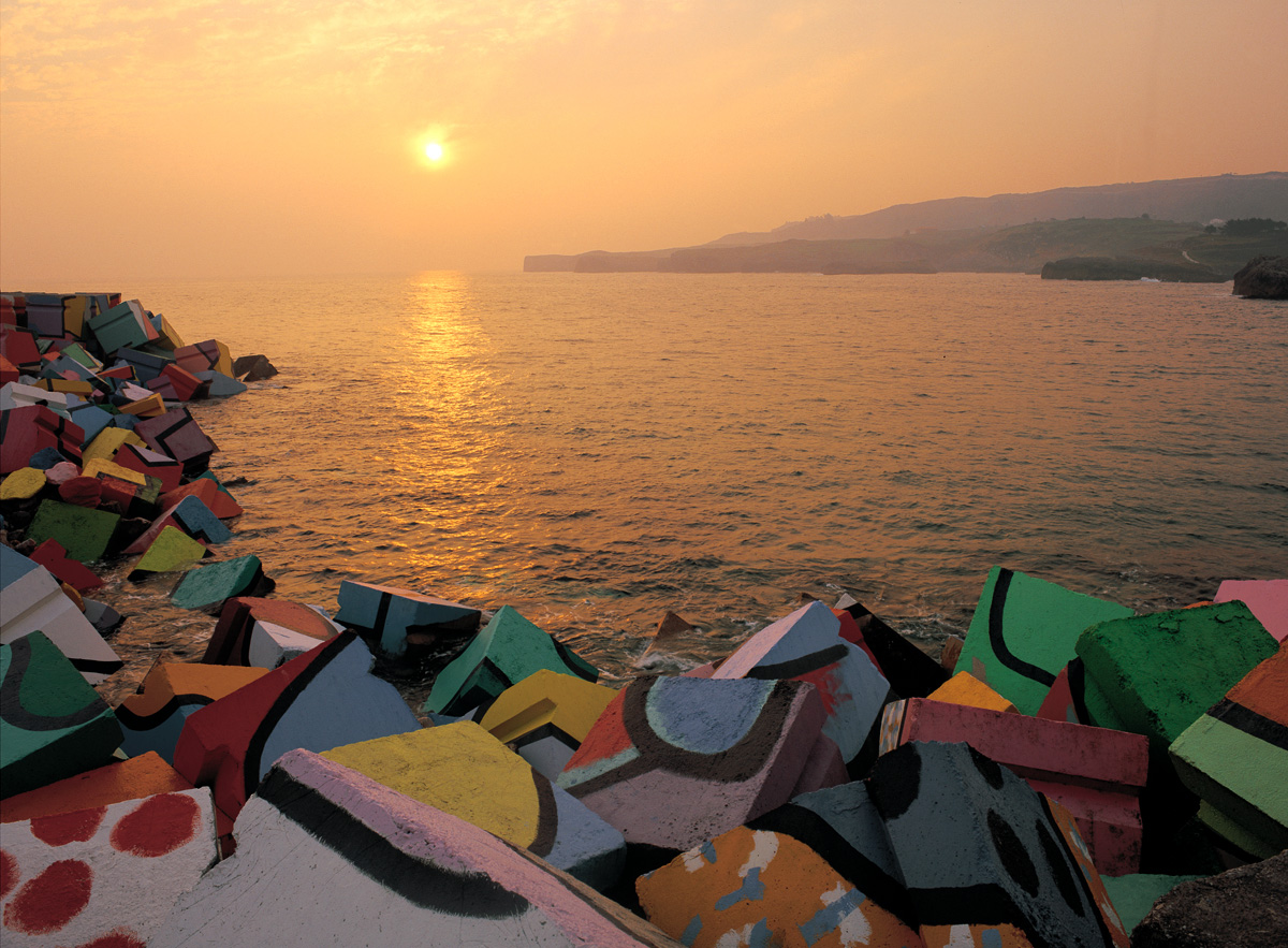 Agustín Ibarrola created this beautiful work of art on the breakwater in the fishing port of Llanes. He created this masterpiece on the blocks of cement which make up the breakwater. It has been described as one of the major works of public art. Within it there are elements of the history of the town, the region and the artist himself.