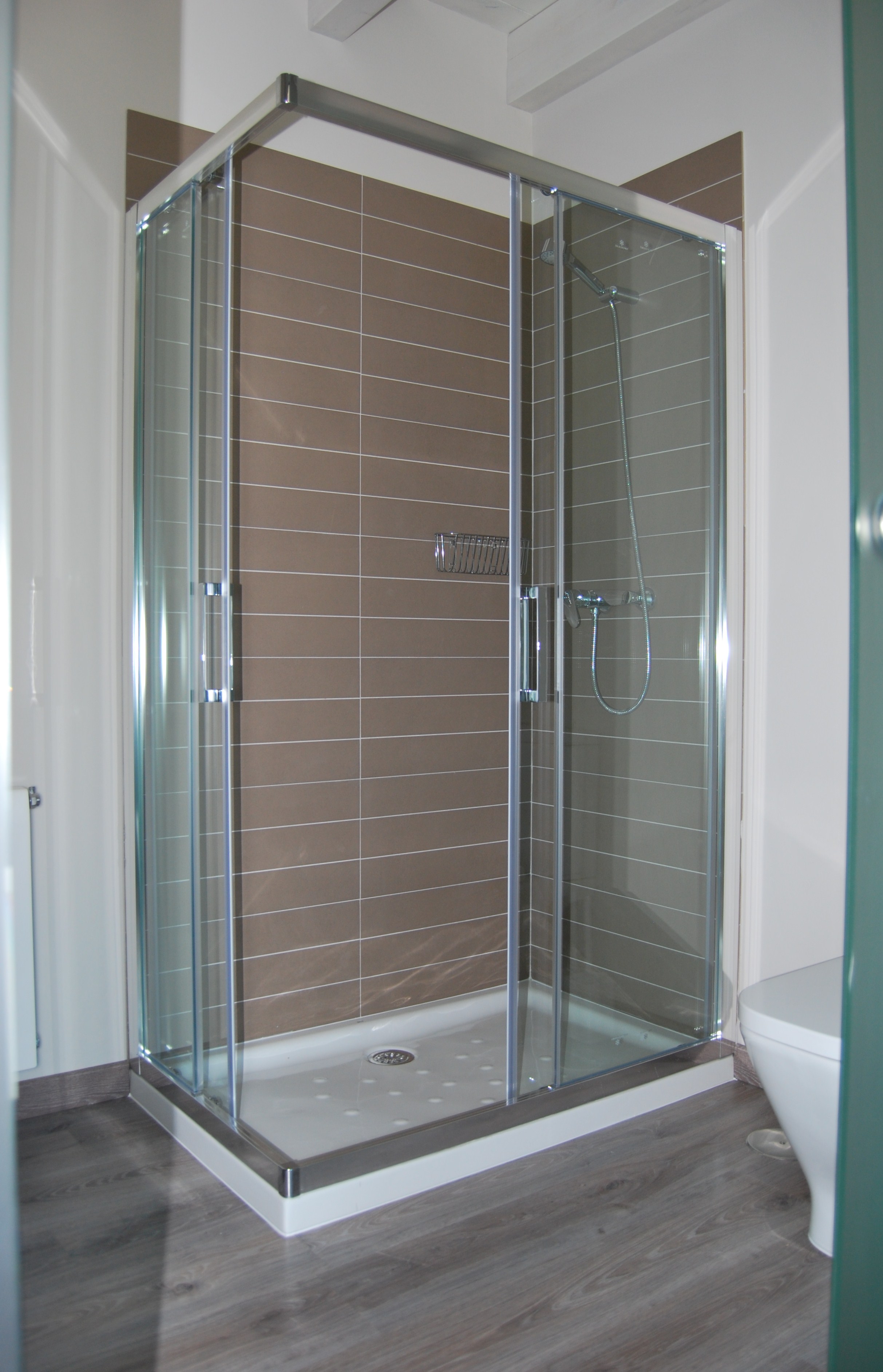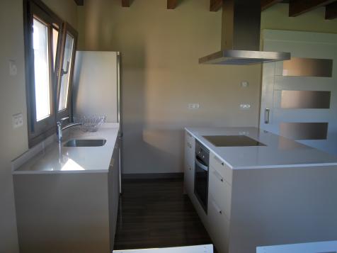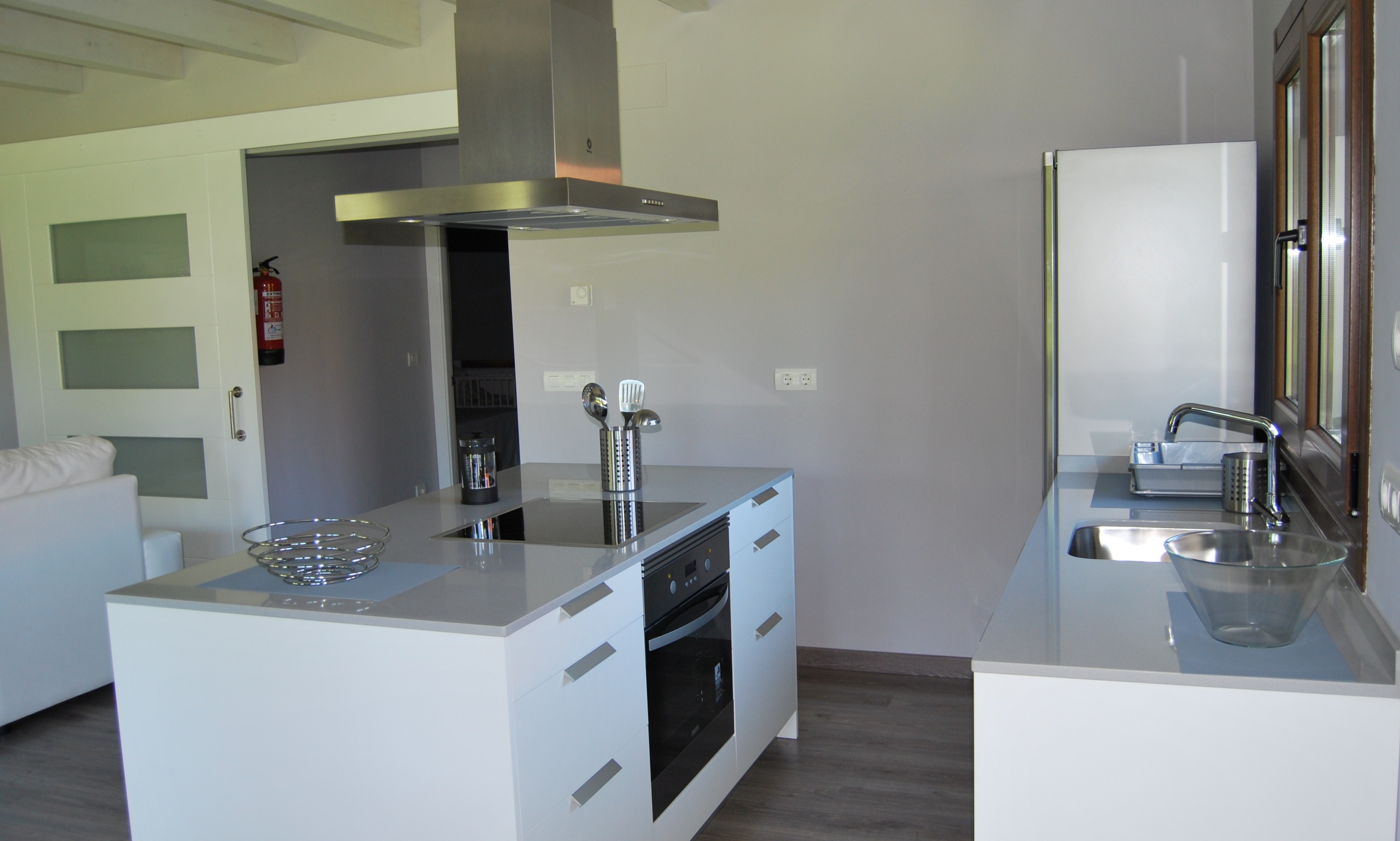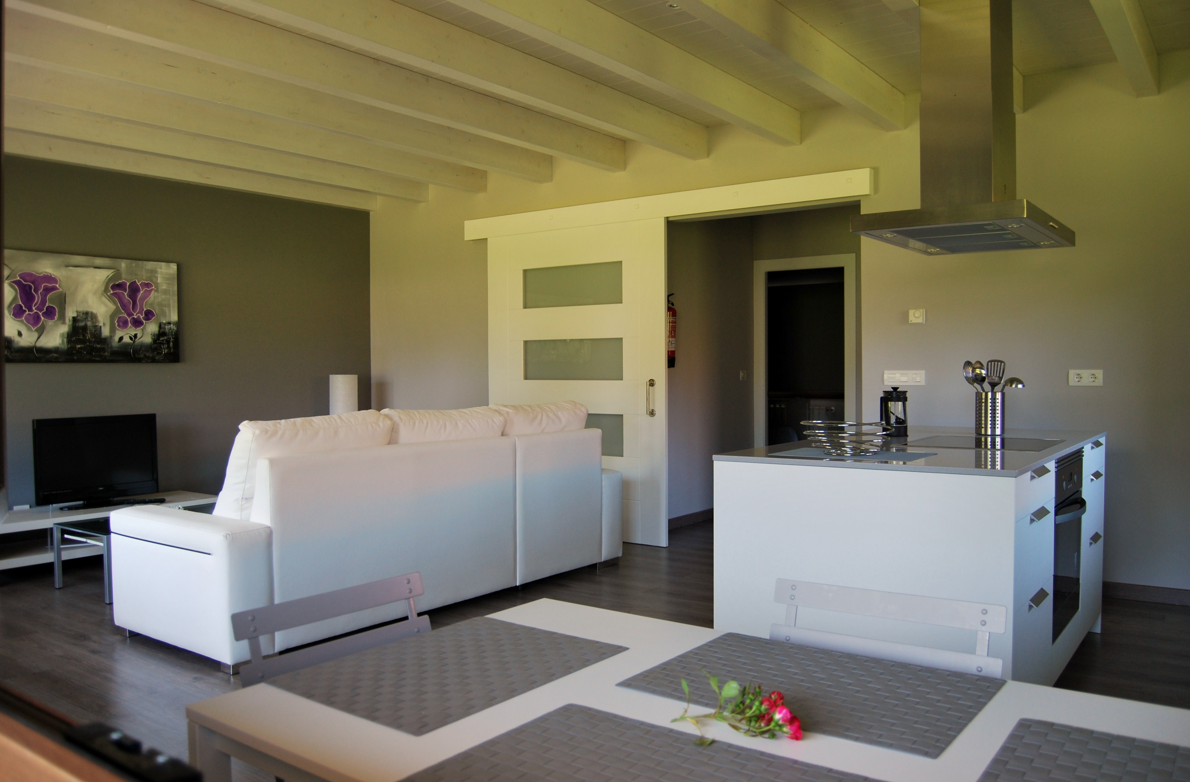 The open-plan kitchenette is integrated into the lounge-diner. Here you will find an oven, hob, microwave and coffee maker, as well as a dishwasher and washing machine.