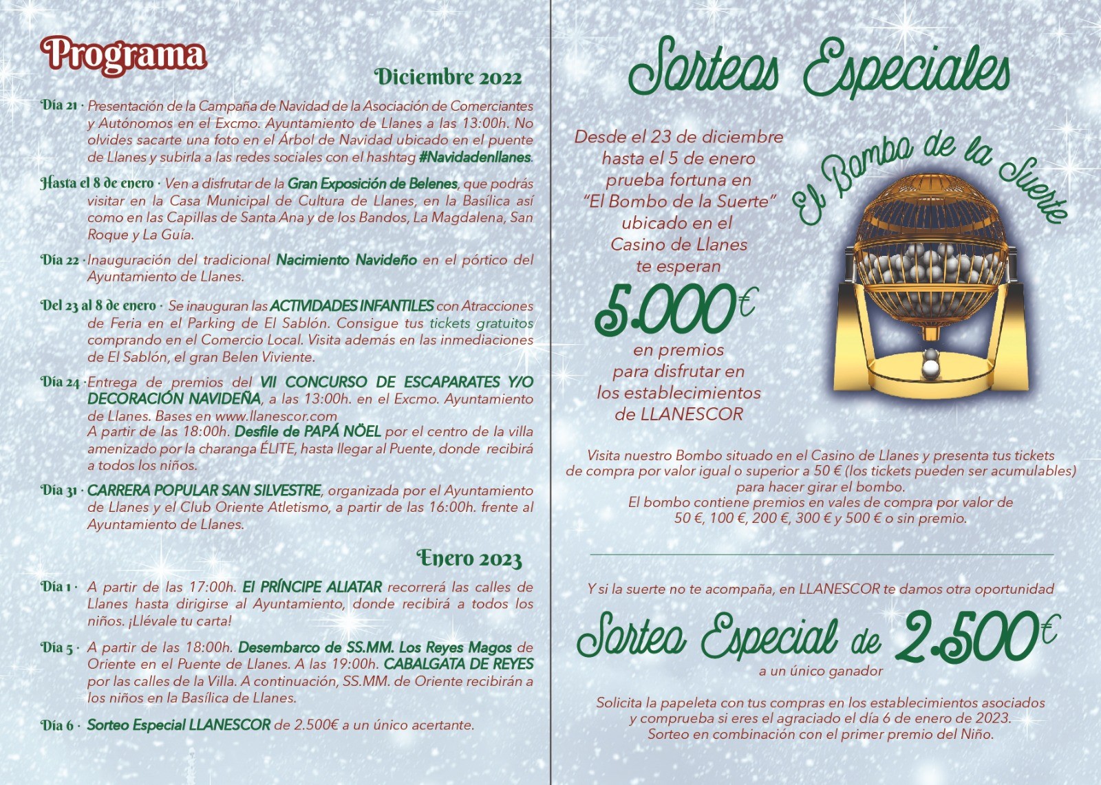 Desde el 23 de diciembre hasta el 5 de enero (excepto el día de Navidad y Año Nuevo) en horario de 12:00 a 14:30 h. visita "el bombo de la suerte" situado en El Casino de Llanes y presenta tus tickets* de compra por valor igual o superior a 50 € (los tickets pueden ser acumulables) para hacer girar el bombo.