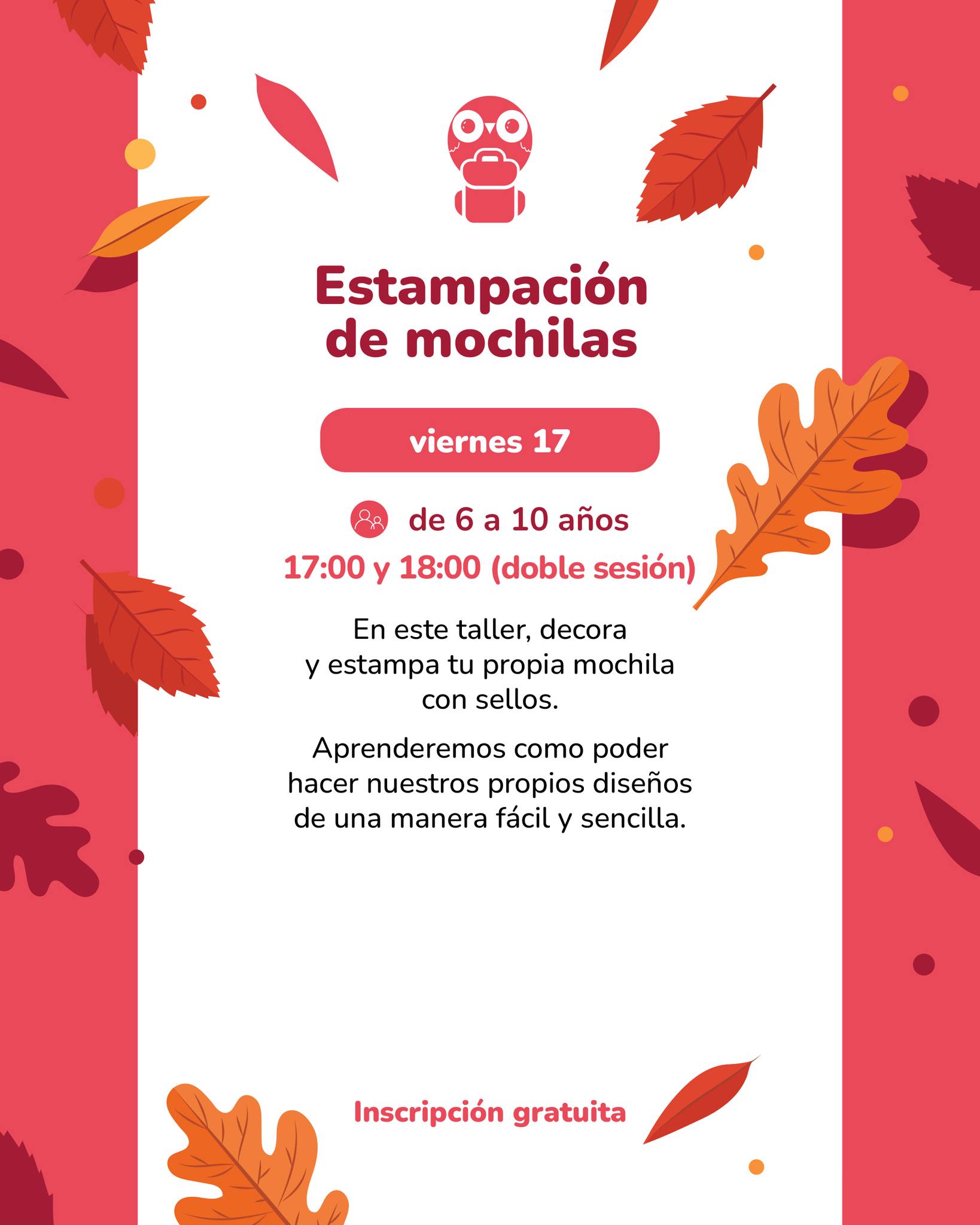 - Viernes 17 · 17:00 y 18:00 — Estampación de mochilas (6–10 años, doble sesión). Inscripción gratuita por teléfono.