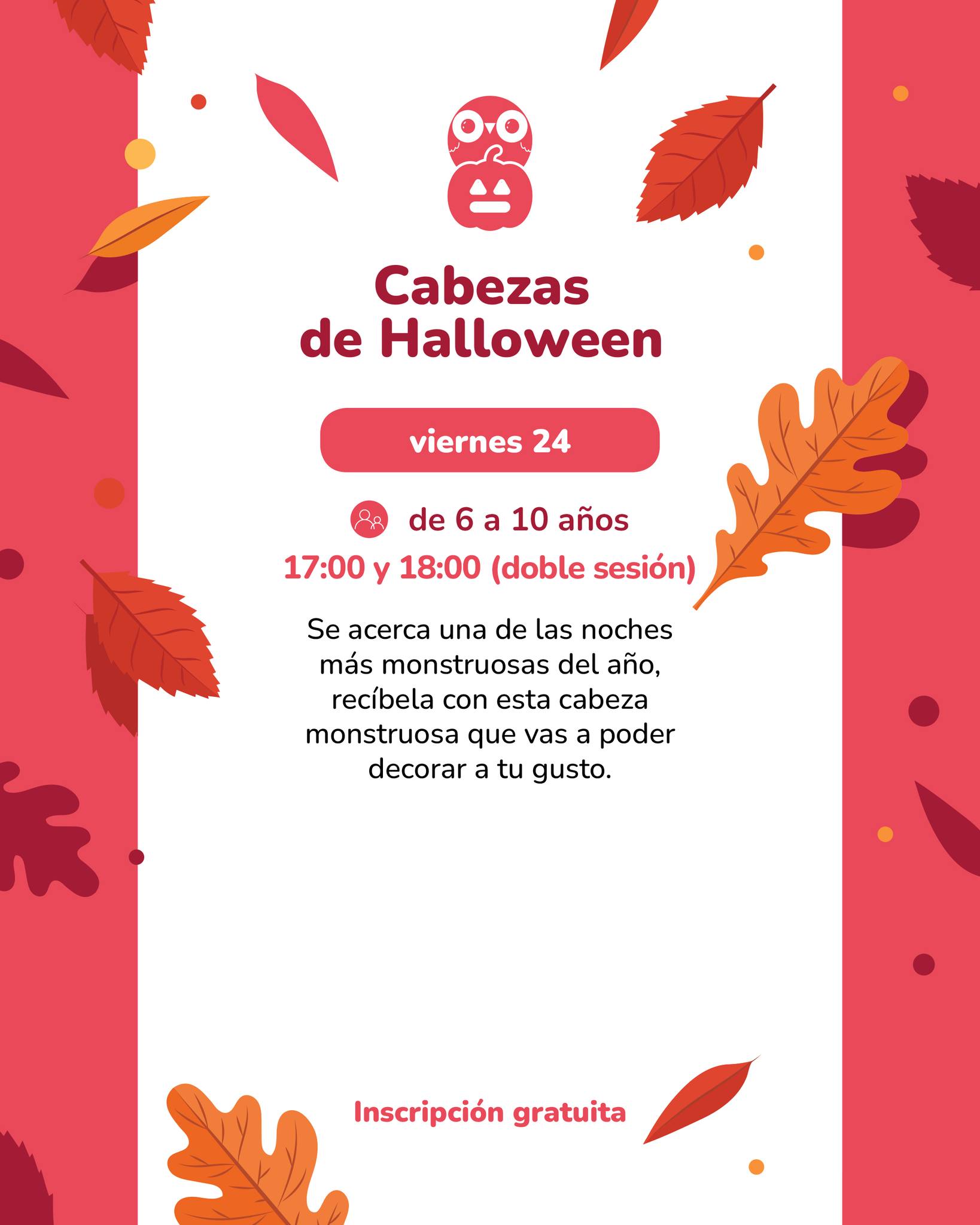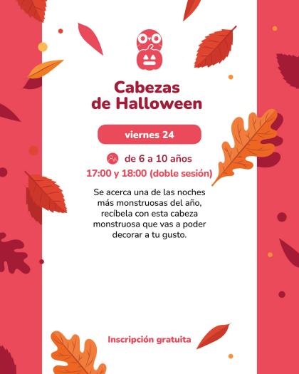 • Viernes 24 · 17:00 y 18:00 — Cabezas de Halloween (6–10 años, doble sesión). Inscripción gratuita por teléfono.