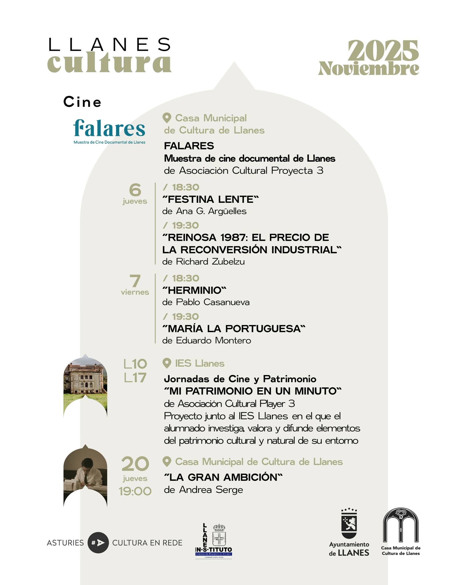 La Casa de Cultura de Llanes acogerá los días jueves 6 y viernes 7 de noviembre una nueva cita con el cine documental contemporáneo, reuniendo obras premiadas y reconocidas en distintos festivales nacionales. Las proyecciones, abiertas al público, ofrecerán una mirada diversa sobre la memoria, el arte, la identidad y las transformaciones sociales.