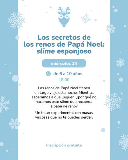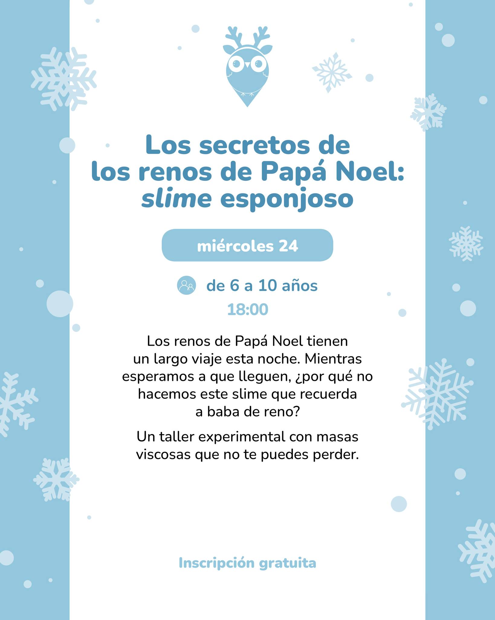 • Miércoles 24 · 18:00 — Los secretos de los renos de Papá Noel: slime esponjoso (6–10 años). Inscripción gratuita por teléfono.