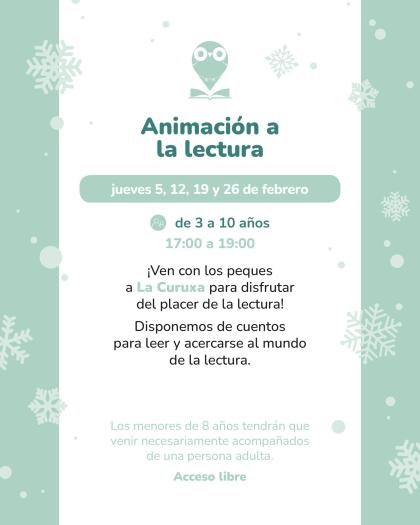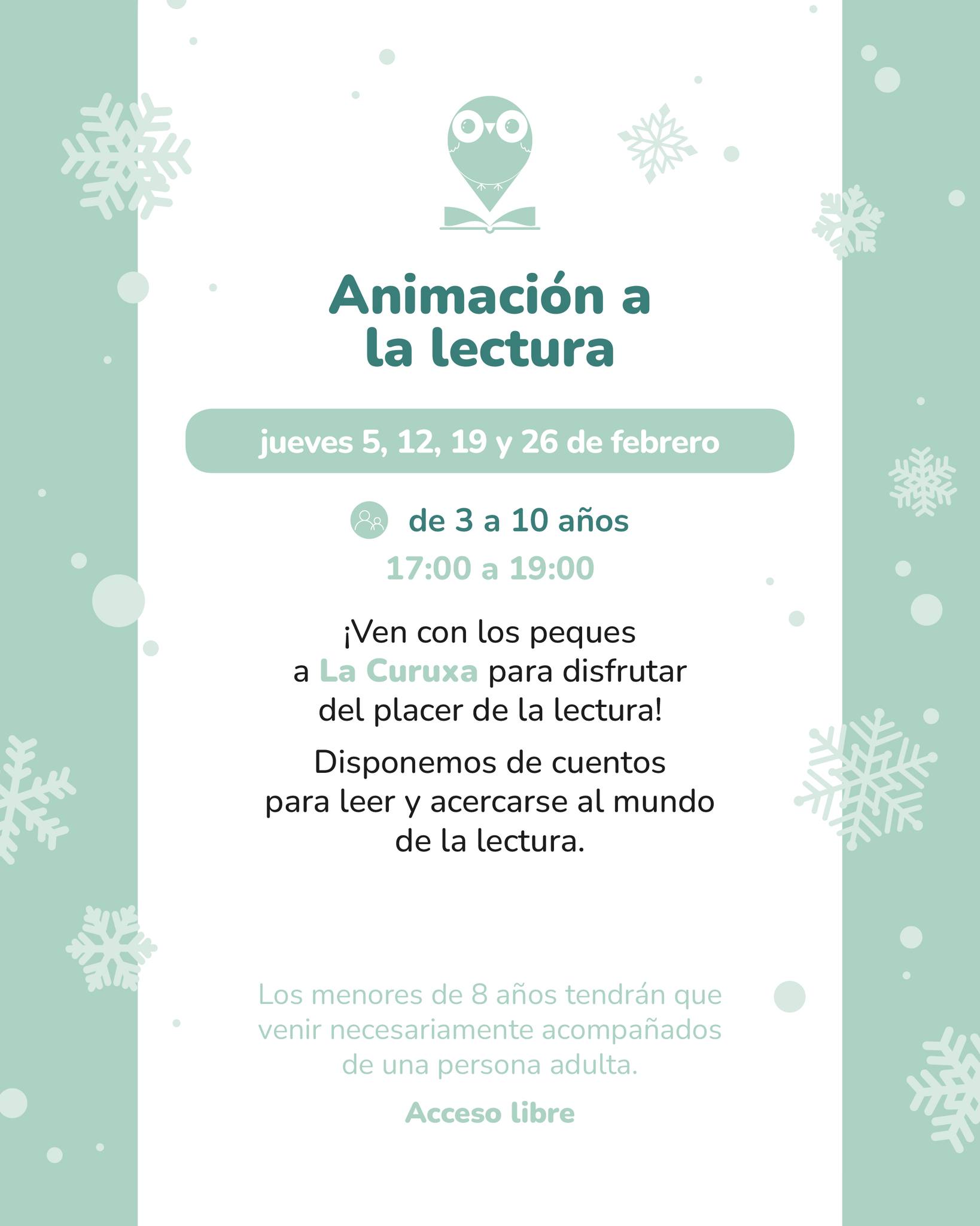 Jue 5, 12, 19 y 26 · 17:00–19:00 — Animación a la lectura (3–10 años). Acceso libre. Menores de 8 años, acompañados de una persona adulta.