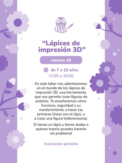 Vie 20 · 17:00–19:00 — “Lápices de impresión 3D” (7–10 años). Inscripción gratuita por teléfono.