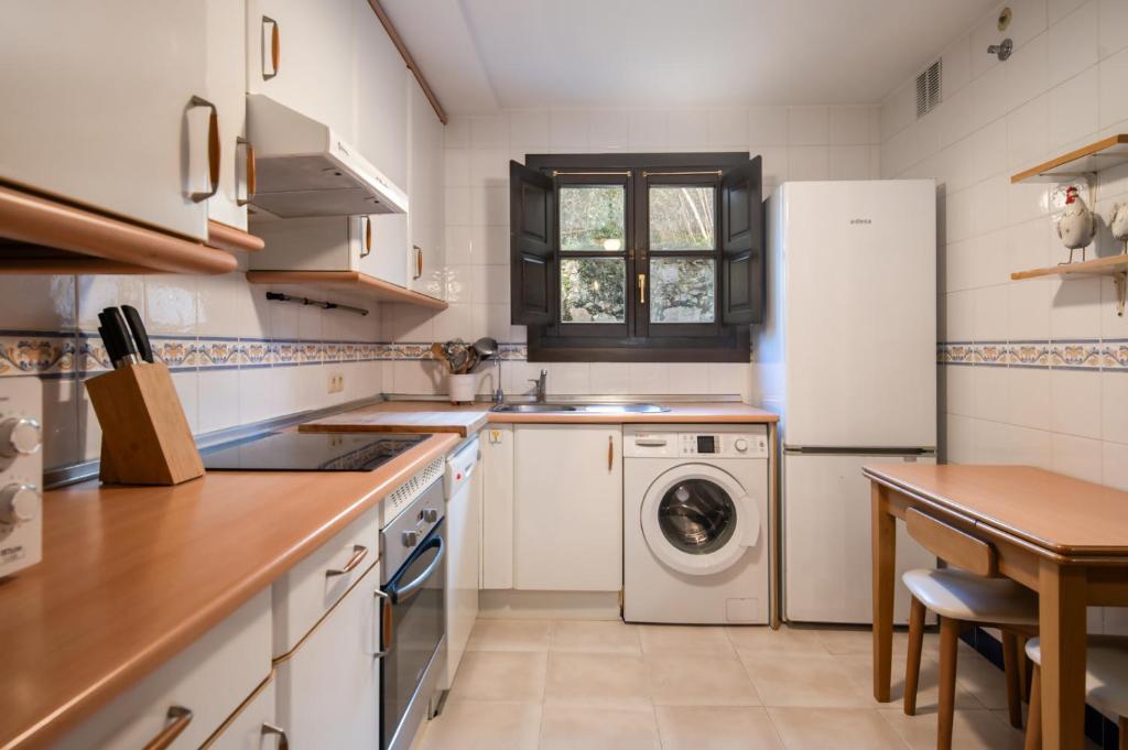 En la planta baja se encuentra la cocina que está equipada con microondas, frigorífico, horno eléctrico, lavavajillas, vitrocerámica, campana extractora, cafetera, batidora eléctrica y servicio completo de menaje.