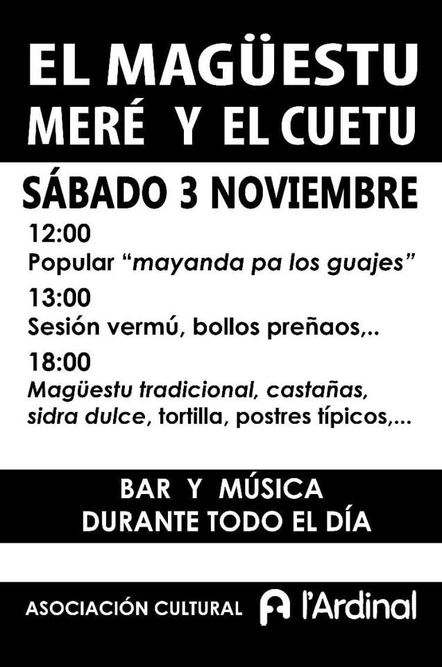 18.00 h. Magüestu tradicional, castañas, sidra dulce, tortilla, postres típicos, ....