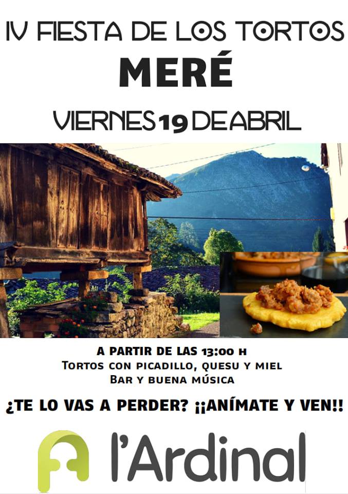 Meré 19 Abril 2019 IV Fiesta de los Tortos (Mere) A partir de las 13.00 h. Tortos con picadillo, quesu y miel. Bar y buena música.