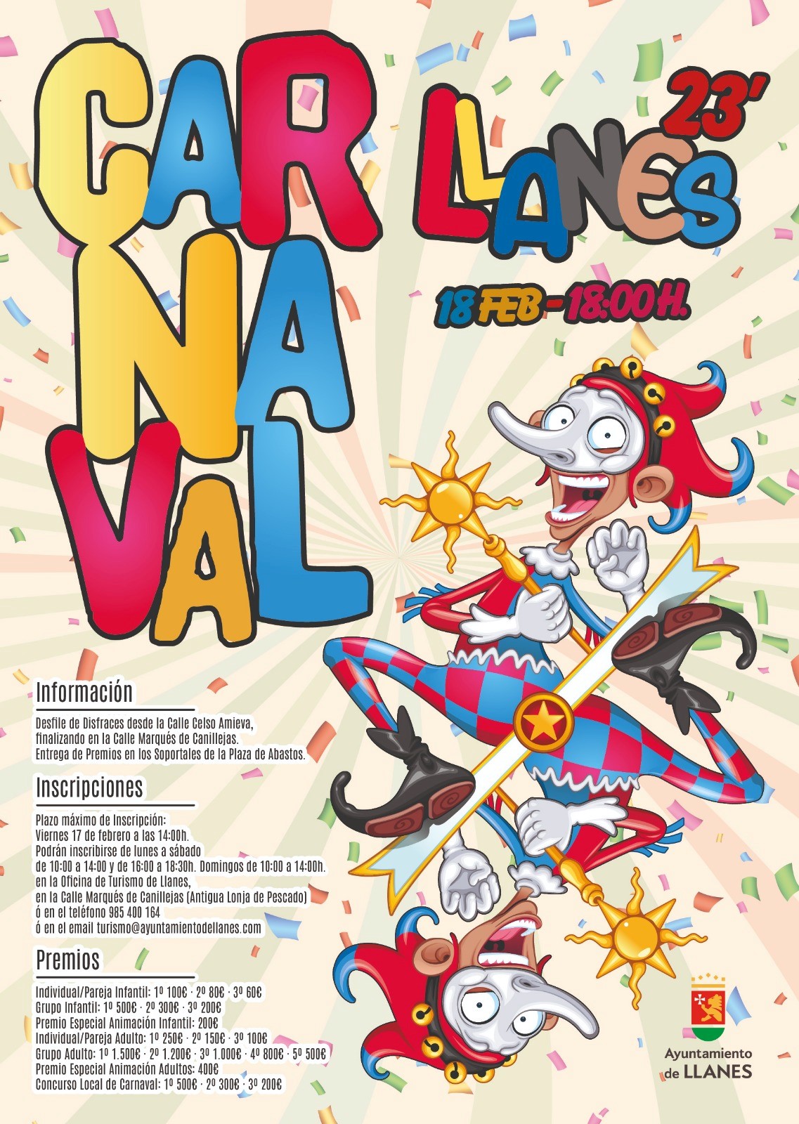 1. El Ayuntamiento de Llanes convoca el Concurso de Disfraces “Carnaval Llanes 2023”. Podrán participar cuantas personas lo deseen con el único requisito de inscribirse previamente en la Oficina de Turismo en C/ Marqués de Canillejas, 1 (Antigua Lonja de Pescado) Llanes, en horario de lunes a sábado de 10:00 a 14:00 y de 16:00 a 18:30 h. Domingos de 10:00 a 14:00 h. Teléfono: 985 400 164. E-mail: turismo@ayuntamientodellanes.com. El plazo de inscripción finaliza el viernes 17 de febrero a las 14:00 h.