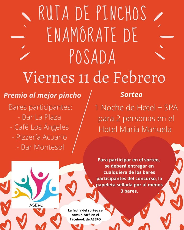 El viernes día 11 de febrero, con motivo de San Valentín, ASEPO ha organizado una Ruta de Pinchos en Posada de Llanes. participan 4 bares: Bar La Plaza, Café Los Ángeles, Pizzería Acuario y Bar Montesol.