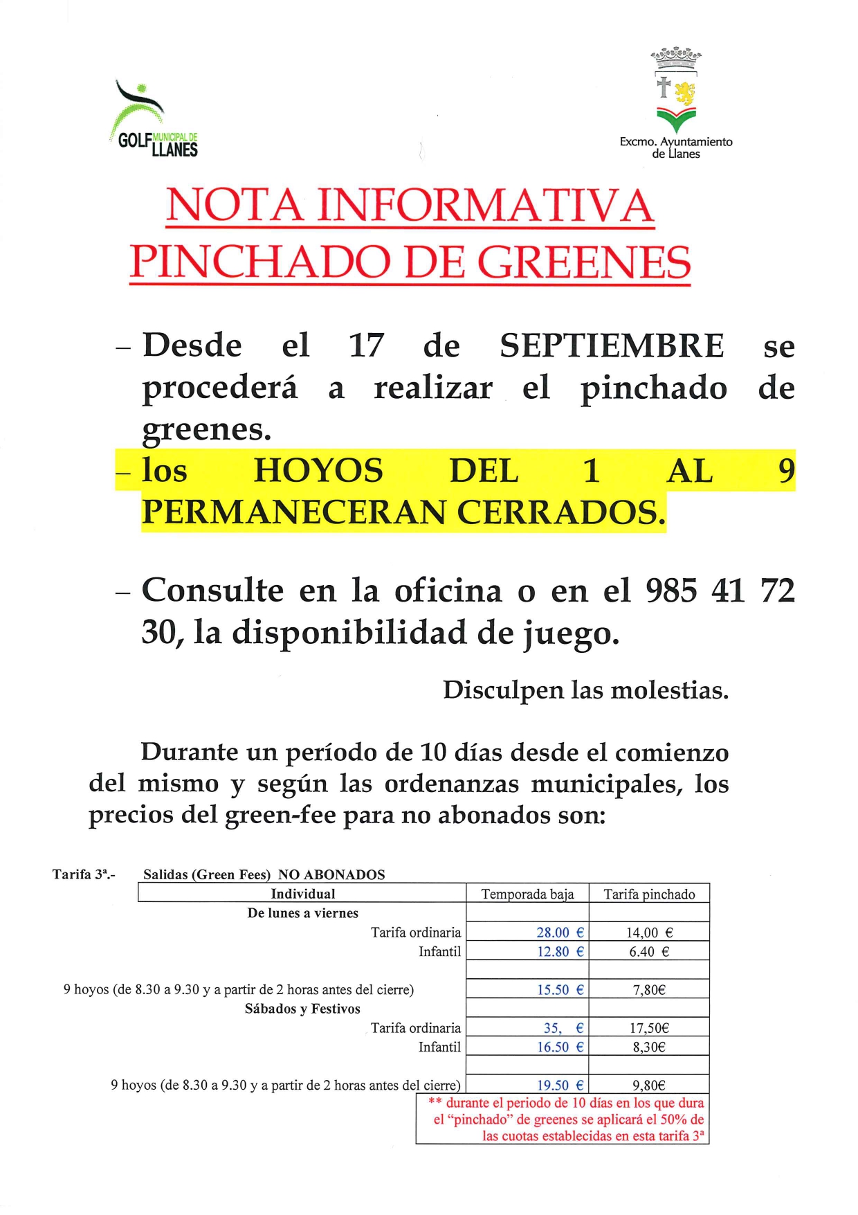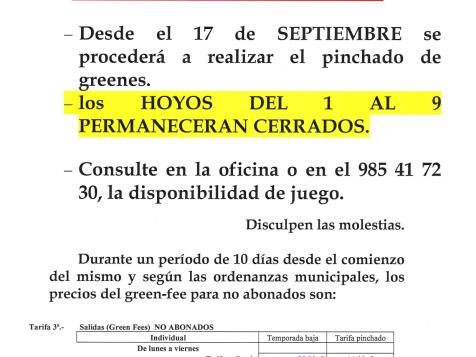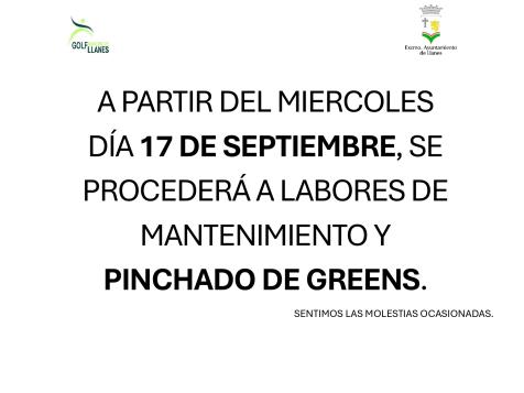 A PARTIR DEL MIERCOLES DÍA 17 DE SEPTIEMBRE, SE PROCEDERÁ A LABORES DE MANTENIMIENTO Y PINCHADO DE GREENS.