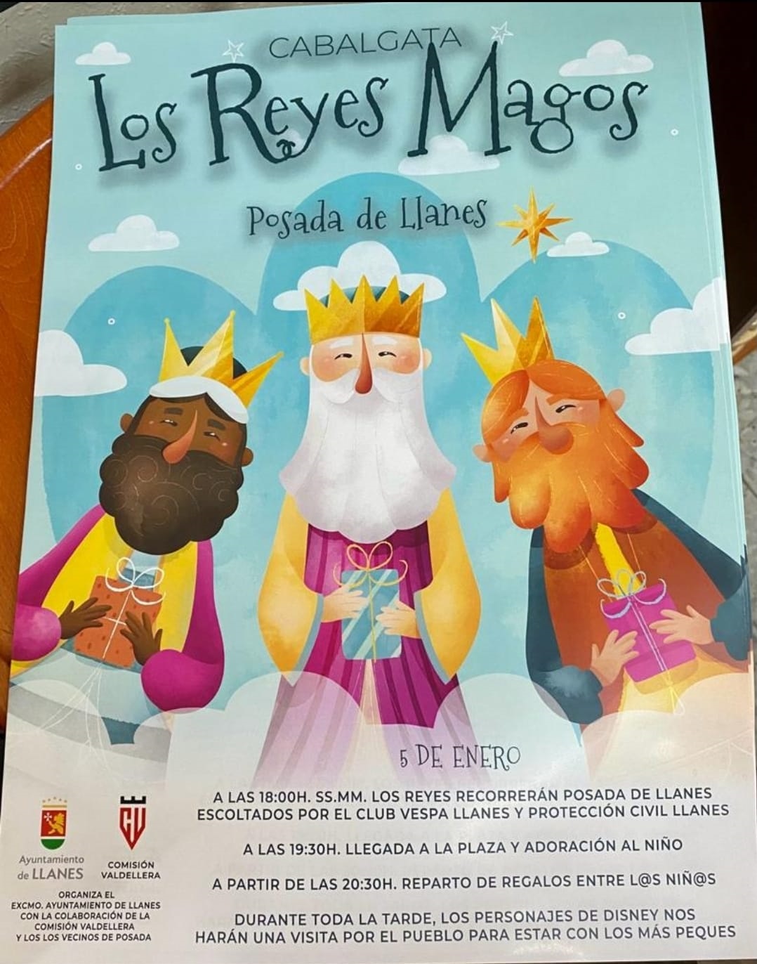 En Posada SS. MM. los Reyes recorrerán las calles en Cabalgata a partir de las 18:00 h, escoltados por el Club de Vespas de Llanes y Protección Civil de Llanes. Se espera la llegada final de Melchor, Gaspar y Baltasar a la plaza a las 19:30 h para proceder a la Adoración del Niño. Y a partir de las 20:30 h se realizará un reparto de juguetes entre los niños y niñas de la localidad.