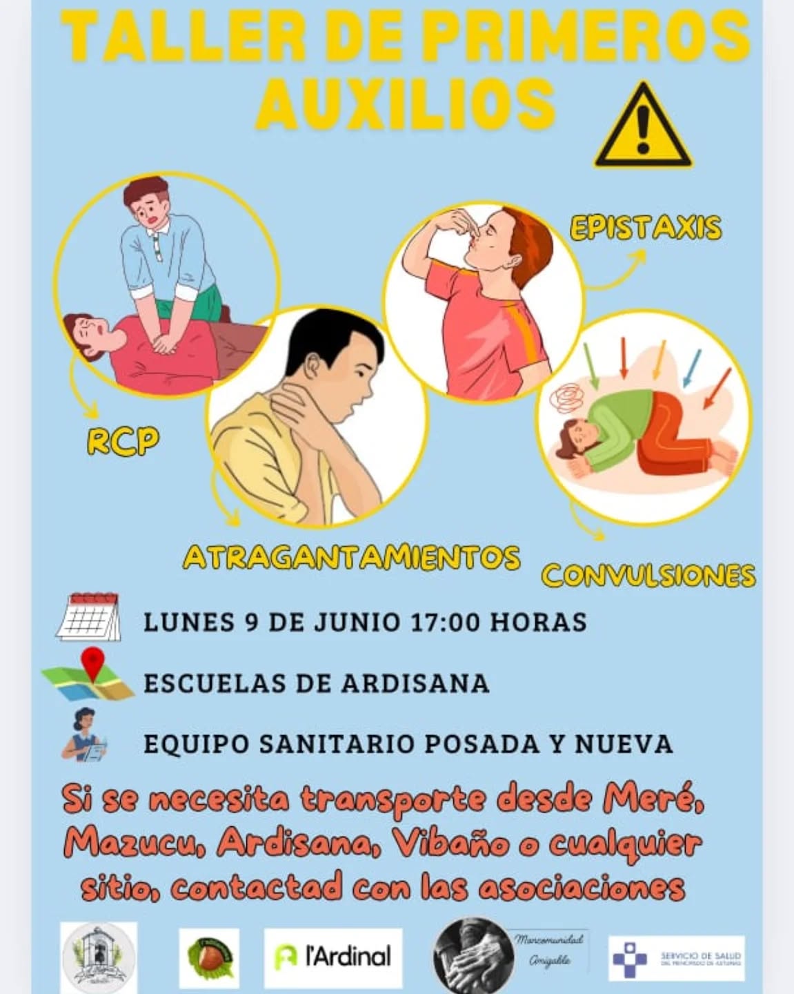 El lunes 9 de junio a las 17:00 h. los equipos médicos de Posada y Nueva impartirán un taller de primeros auxilios en la escuela de Ardisana.