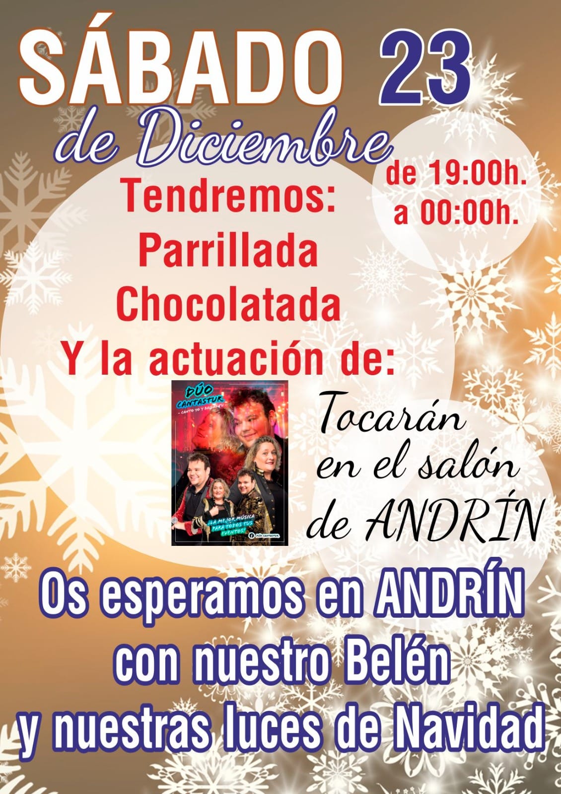Además el sábado 23 de 19:00 a 00:00 h. habrá parrillada, chocolatada y la actuación de: Dúo CANTASTUR que tocarán en el Salón de Andrín. También actuará de 19:00 a 20:00 h. Néstor.