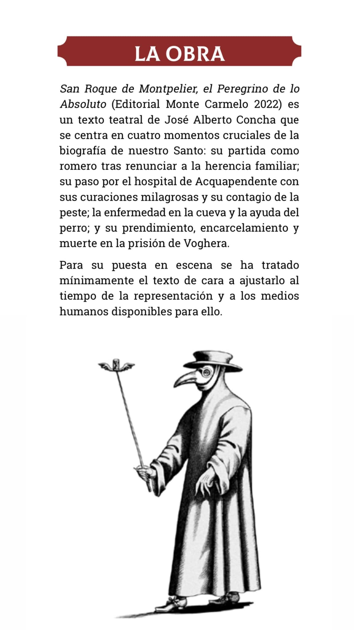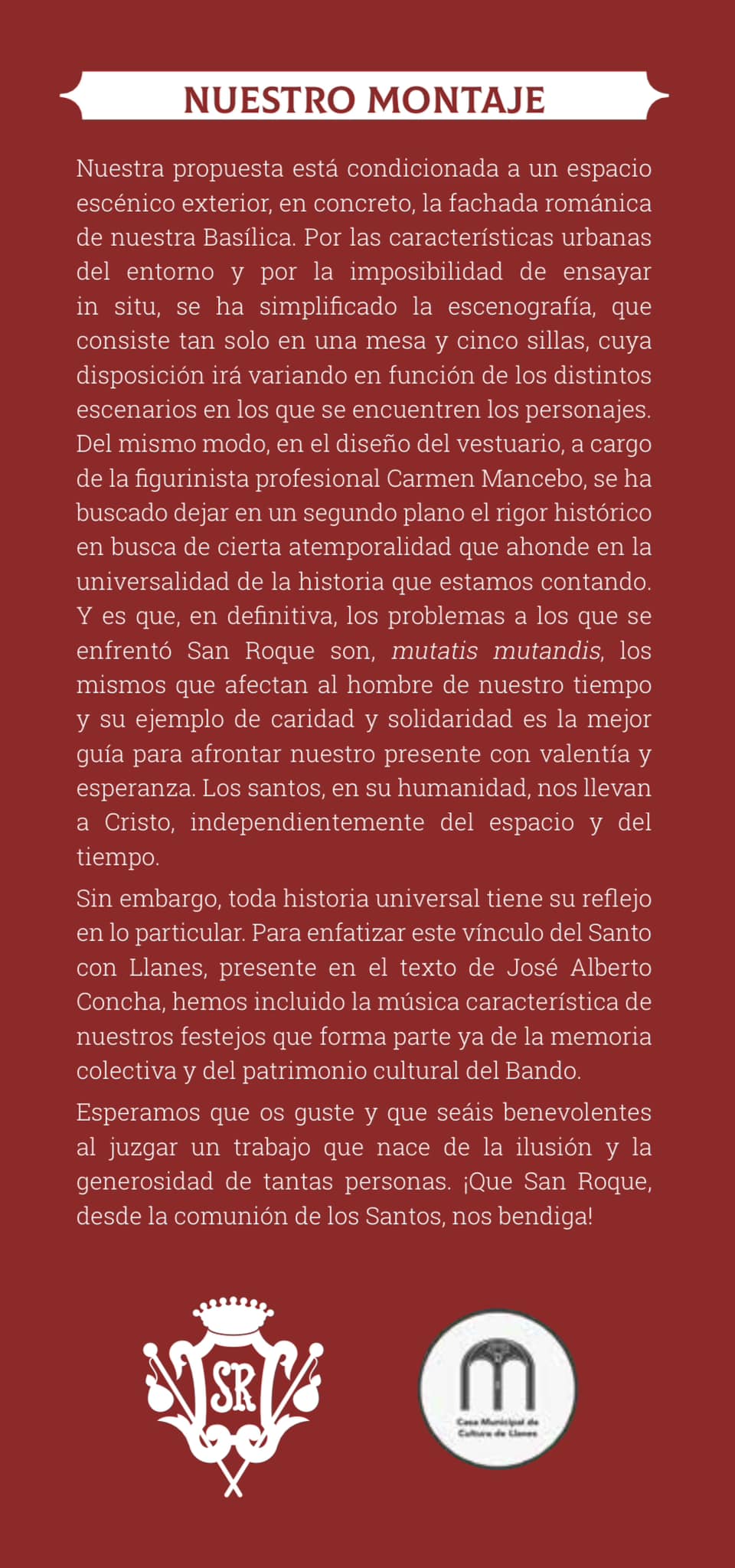 A las 21:00 h., ante el pórtico románico de la Basílica de Llanes, REPRESENTACIÓN TEATRAL de la obra “SAN ROQUE DE MONTPELLIER, EL PEREGRINO DE LO ABSOLUTO”, dirigida por Yolanda Mancebo.