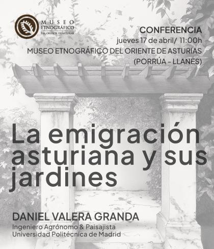 El jueves, 17 de abril, a las 11:00 horas, os invitamos a una conferencia a cargo de Daniel Valera, ingeniero agrónomo paisajista. Bajo el título "La emigración asturiana y sus jardines", Valera nos guiará a través del impacto del fenómeno de la emigración en Asturias y cómo este proceso transformó nuestra manera de concebir el jardín, desde la tradicional huerta asturiana hasta los jardines ornamentales que hoy forman parte del patrimonio cultural asturiano.