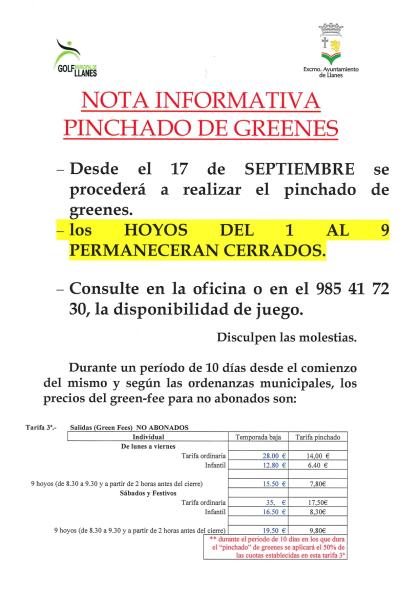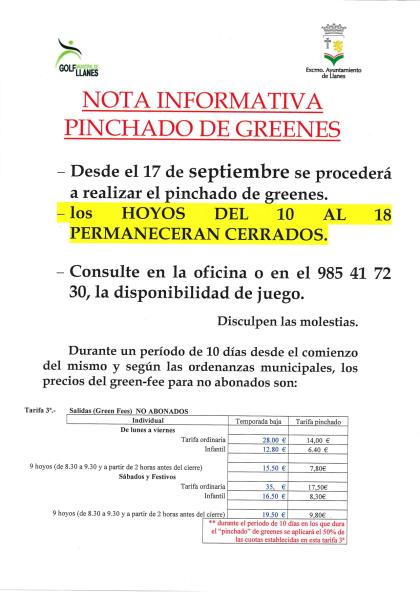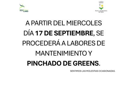 A PARTIR DEL MIERCOLES DÍA 17 DE SEPTIEMBRE, SE PROCEDERÁ A LABORES DE MANTENIMIENTO Y PINCHADO DE GREENS.