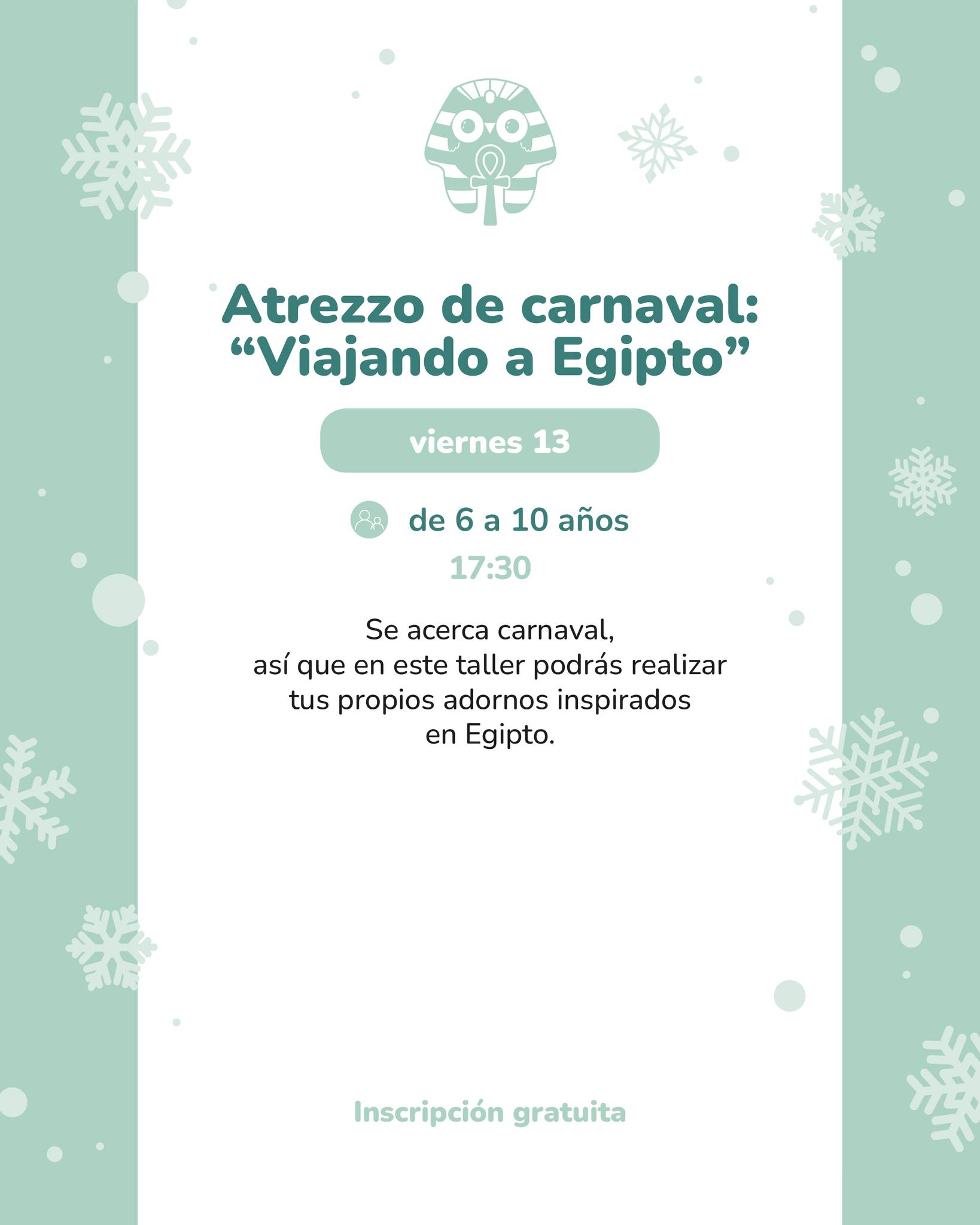 Vie 13 · 17:30 — Atrezzo de carnaval: “Viajando a Egipto” (6–10 años). Inscripción gratuita por teléfono.